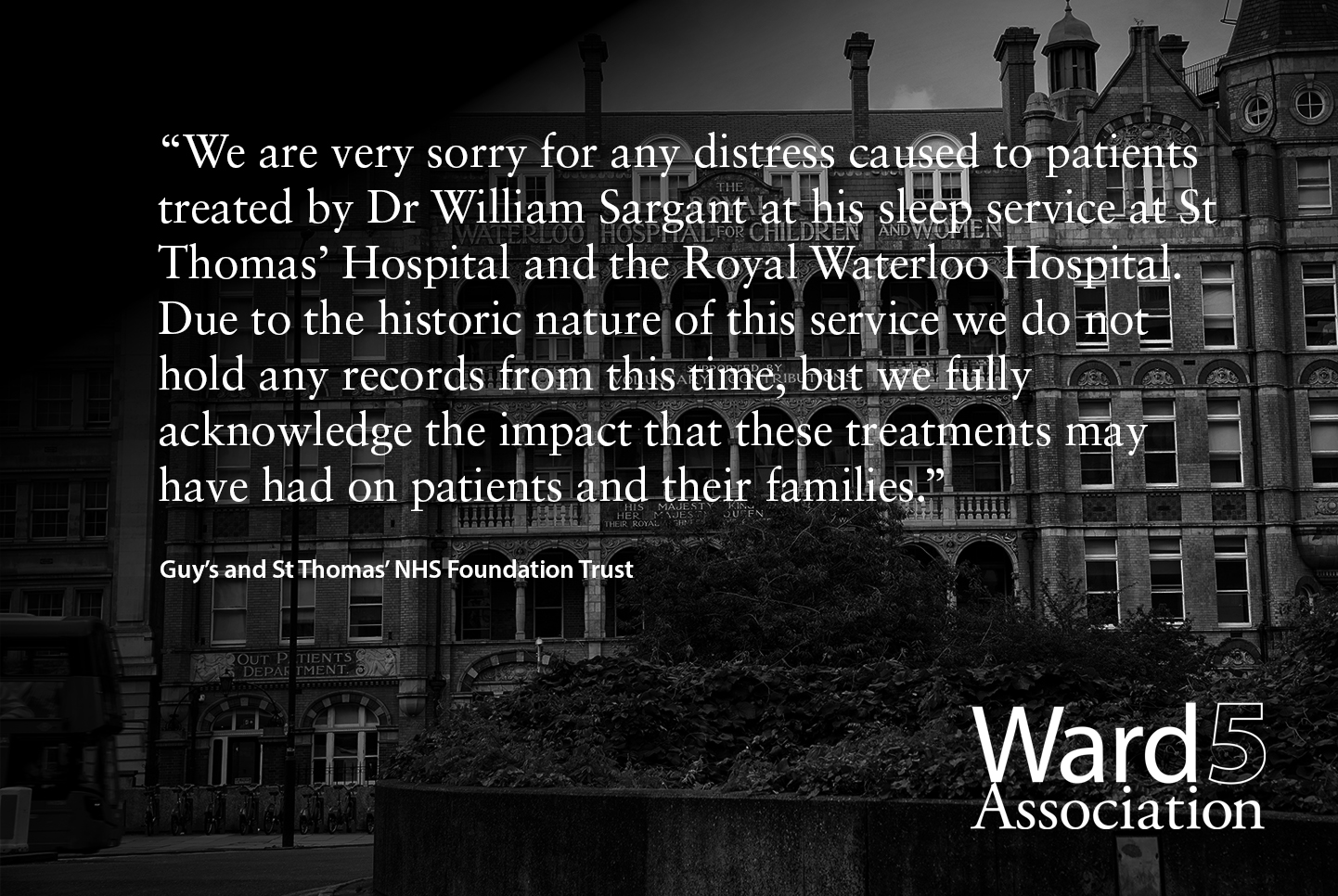 The Ward 5 Association will shortly begin it’s campaign for justice for survivors of Narcosis Treatment and will include those who were treated in units other than Ward 5 at The Royal Waterloo.